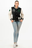 Make a bold statement with this patch varsity bomber jacket, designed with classic details and a modern edge. Featuring varsity-inspired patches and a button-down front, this jacket blends athletic influence with street-ready style. The relaxed fit and functional pockets add everyday practicality, while the soft stretch fabric offers comfort and ease of movement. Available in seven standout colors and a full size range from S to XL, it’s the perfect outer layer for cool weather or casual layering. Models are wearing US size S.