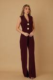 The Open Flap with Metal Shank Button Jumpsuit brings bold structure and high-fashion detail to a refined silhouette. Designed with a sharp collar and sleeveless cut, this standout piece features a dramatic open flap overlay that cascades down to foot length, creating a flowing, layered effect. Irregular gold metal shank buttons add a sculptural, polished accent to the front, elevating the overall design. Made from a smooth stretch fabric, it offers both comfort and form-flattering shape. A concealed back zipper completes the look with a clean, streamlined finish — ideal for upscale occasions and fashion-forward moments.