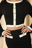 Polished and refined, this classy two-piece suit set blends feminine charm with structured tailoring. The set features a contrast top and skirt combination, each detailed with ruffle flares—on the long sleeve cuffs and along the skirt hem—for a graceful, eye-catching finish. Pearl stones framed in gold add a luxe accent, enhancing the set's elevated appeal. Crafted from a soft, stretch-infused fabric, it offers a flattering fit with comfortable wear. A back zipper ensures easy dressing while maintaining a smooth, tailored look.
