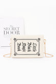 Add a whimsical touch to your ensemble with the Your Magic Book Clutch. Shaped like a vintage hardcover, this charming accessory features printed text and ornate patterns across its exterior. It’s finished with a metallic chain strap that lets you wear it as a crossbody or carry it by hand. Compact yet functional, it’s perfect for holding small essentials like your phone, cards, and lipstick. Crafted from polyurethane and mixed metal, this clutch is a storybook-inspired statement piece for lovers of fashion and fantasy alike.