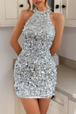 Sparkly Beaded Halter Bodycon Mini Dress
