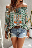 Boho Print Off Shoulder Long Sleeve Knot Front Blouse